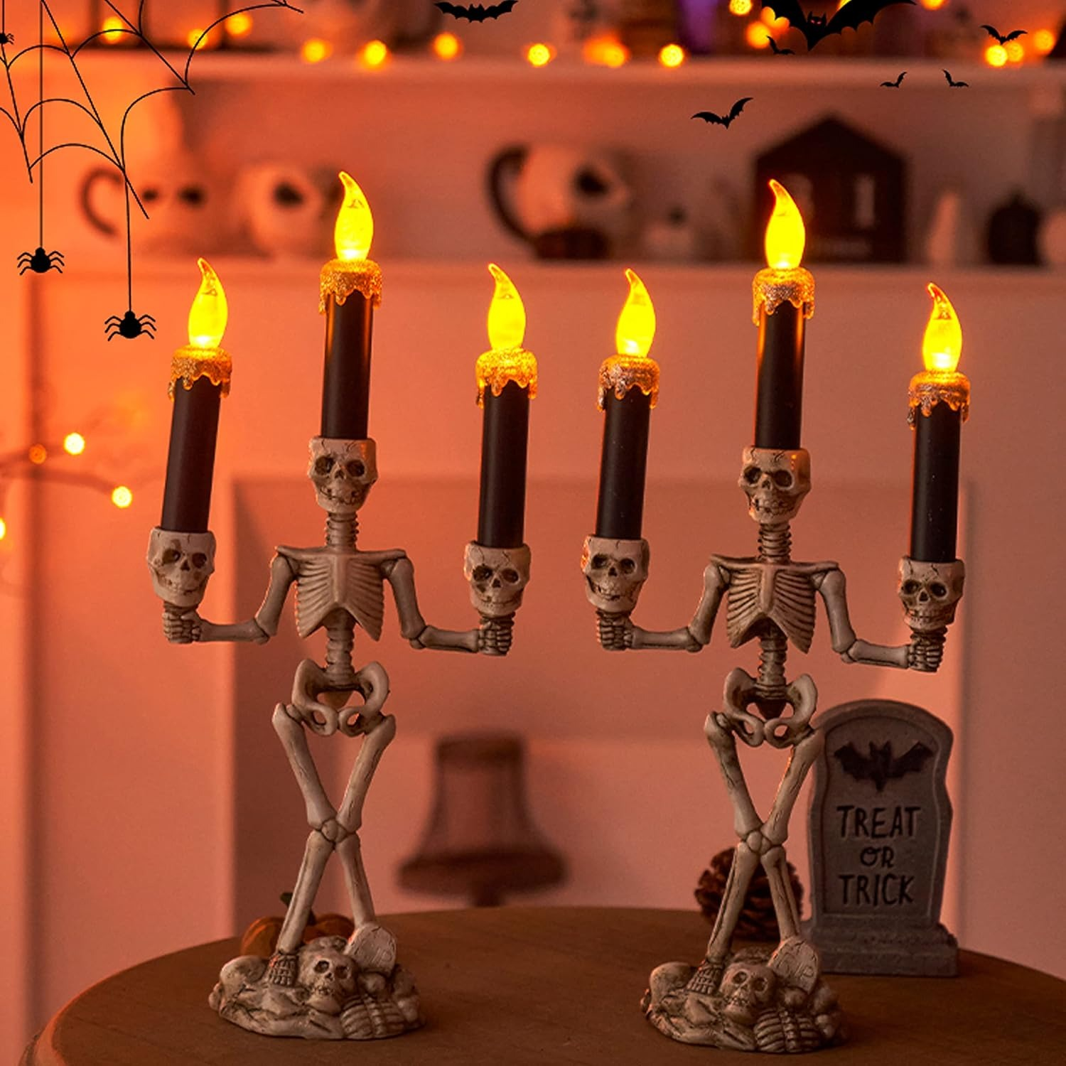 Personalized Design: Flameless Skeleton Candlestick Halloween candlestick consists of a white skeleton base and three black LED lights, it is unique and generous thanks to the use of simulation candles.